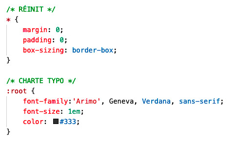 de Google Fonts afin d'importer la police de caractères de votre choix. (Voir en classe pour les détails.) - À la suite de Google Fonts, ajoutez les règles de style de réinitialisation habituelles :