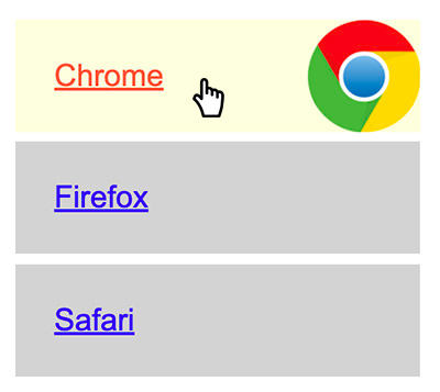 Vérifiez le résultat. Au survol du lien, l'image devrait maintenant être visible au complet : - C'est réussi, mais vous avez reproduit le même effet pour les quatre liens. Personnalisez les effets pour chacun des liens en utilsant correctement le sélecteur
