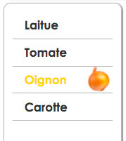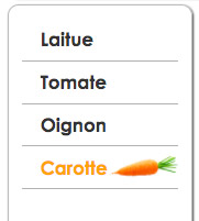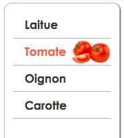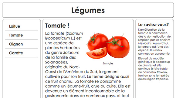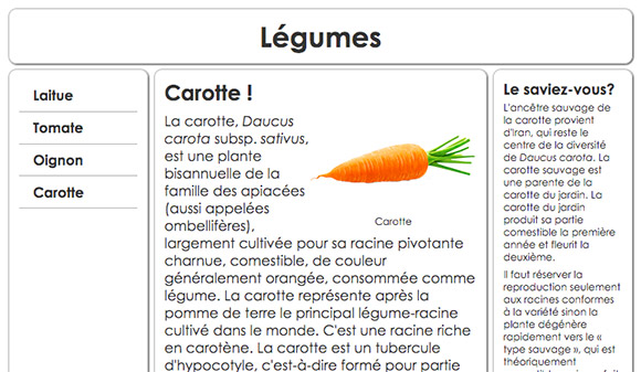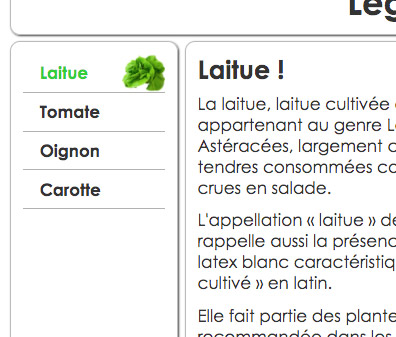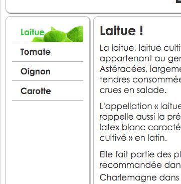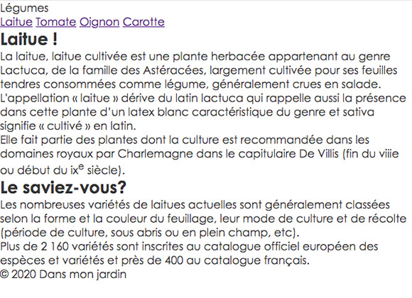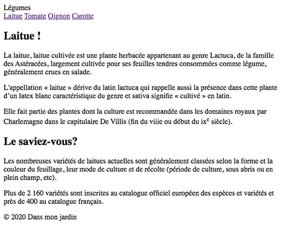 Pour chacun des liens, ajustez la couleur du texte et associez la bonne image de légume afin d'obtenir un résultat semblable à ceci : - Vous allez maintenant modifier le code HTML pour ajouter une image et sa légende dans le texte, soit juste sous l'élément