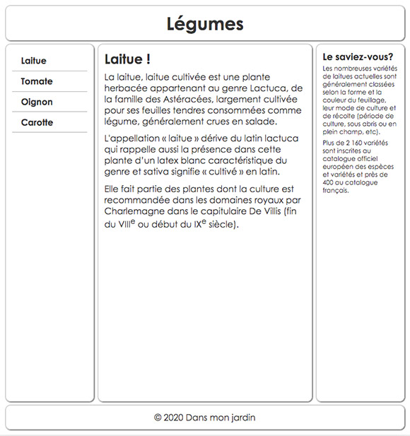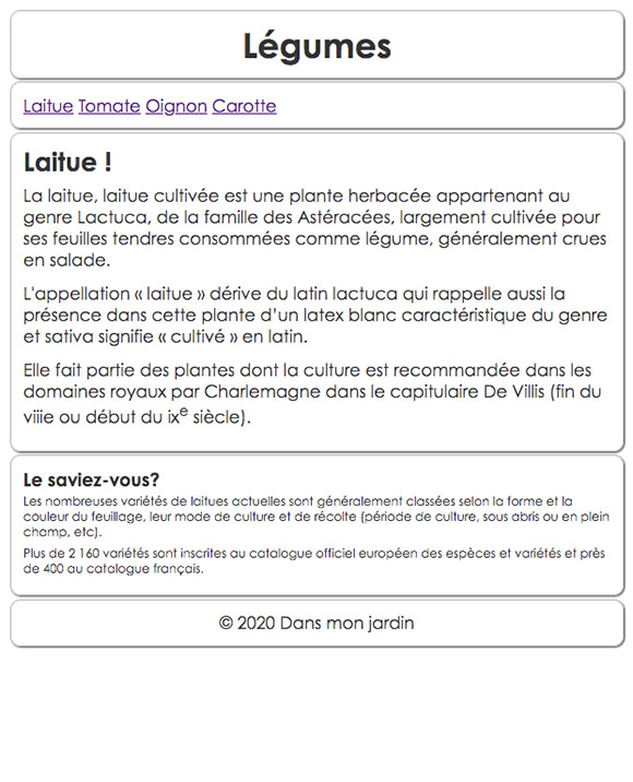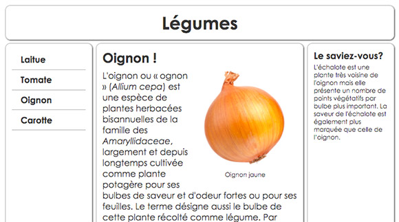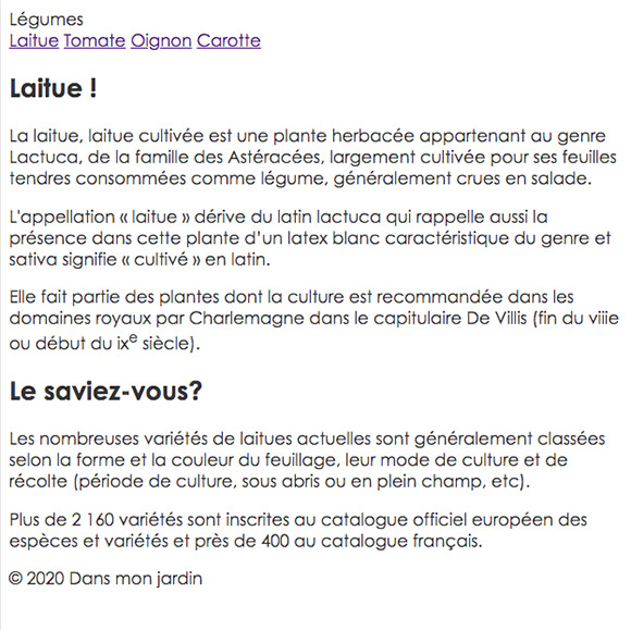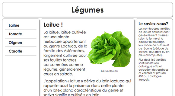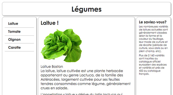 Pour chacun des liens, ajustez la couleur du texte et associez la bonne image de légume afin d'obtenir un résultat semblable à ceci : - Vous allez maintenant modifier le code HTML pour ajouter une image et sa légende dans le texte, soit juste sous l'élément
